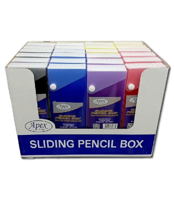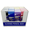 • Pack of 48 sliding pencil boxes in assorted colors.