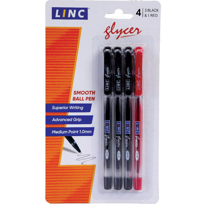 LINC GLYCER Ballpen , 4pk (3black + 1 red) , Case Pack of 48, Ideal for Bulk Buyers. These smooth ball point has a medium tip of 1.0mm. It provides superior writing and advanced grip. These are used by students and people at work to write with it. It is easy to use, handy in size and travel friendly too.