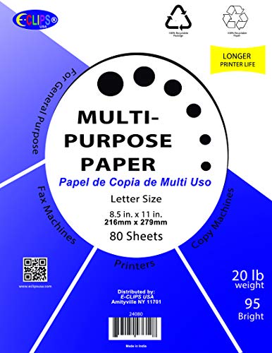 Multi-Purpose Paper, 80 sheets , Case Pack of 60 , Ideal for Bulk Buyers. This Multipurpose paper can be used for general purposes such as writing or drawing and etc. It can also be used for fax machines , printers and copy machines. It is in letter size i.e 8.5" x 11". There are 80 sheets in a pack and they are 95 Bright and the weight is 20 lbs.- It is in letter size i.e 8.5" x 11"