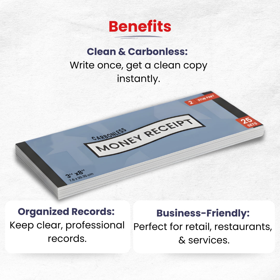 - The size of money receipt book is 3" x 8". This receipt book is used to keep track of customer records for rental purposes