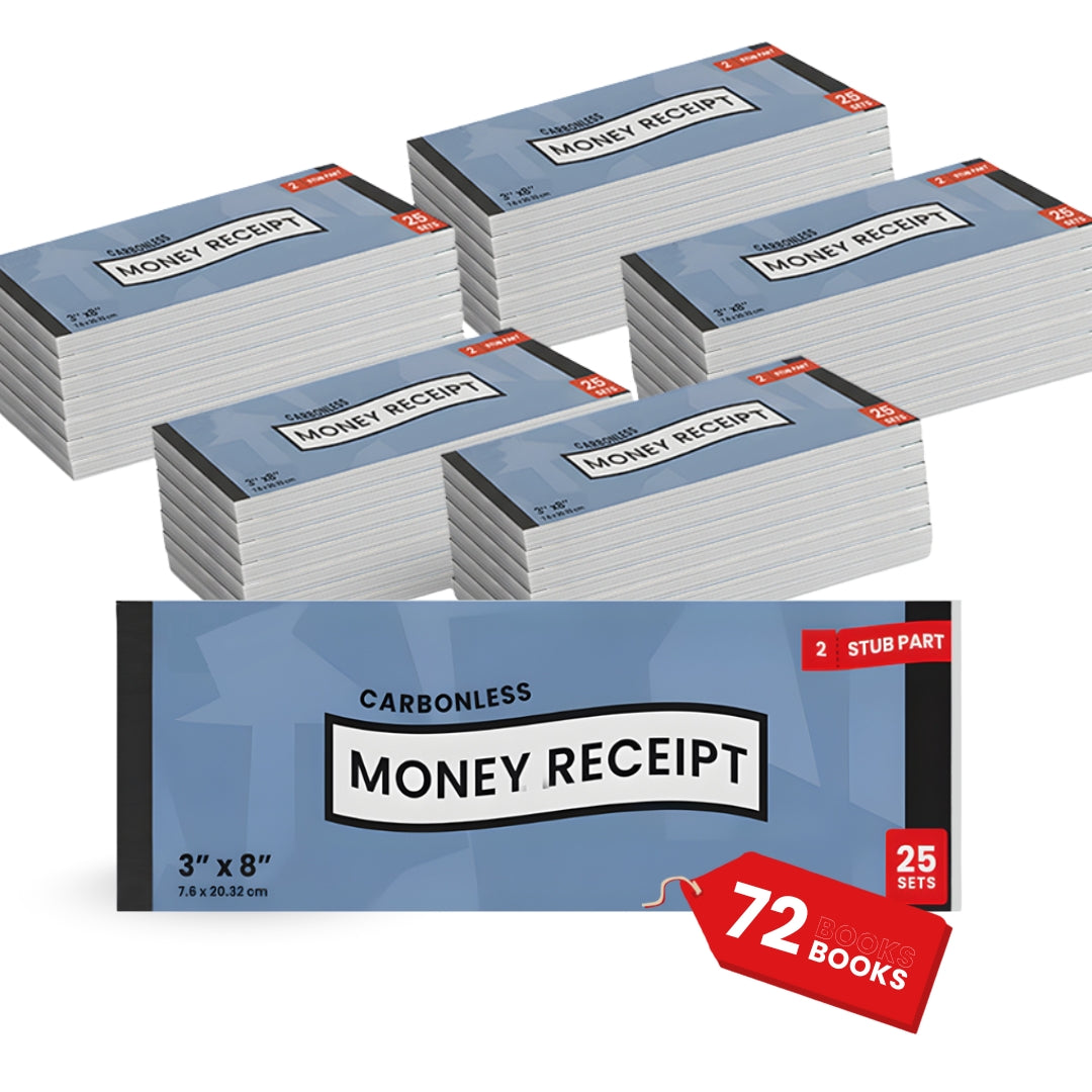 Money Receipt Book, Carbonless, 3"x 8", 25 Sets, 50 Sheets,Case Pack of 72, Ideal for Bulk Buyers